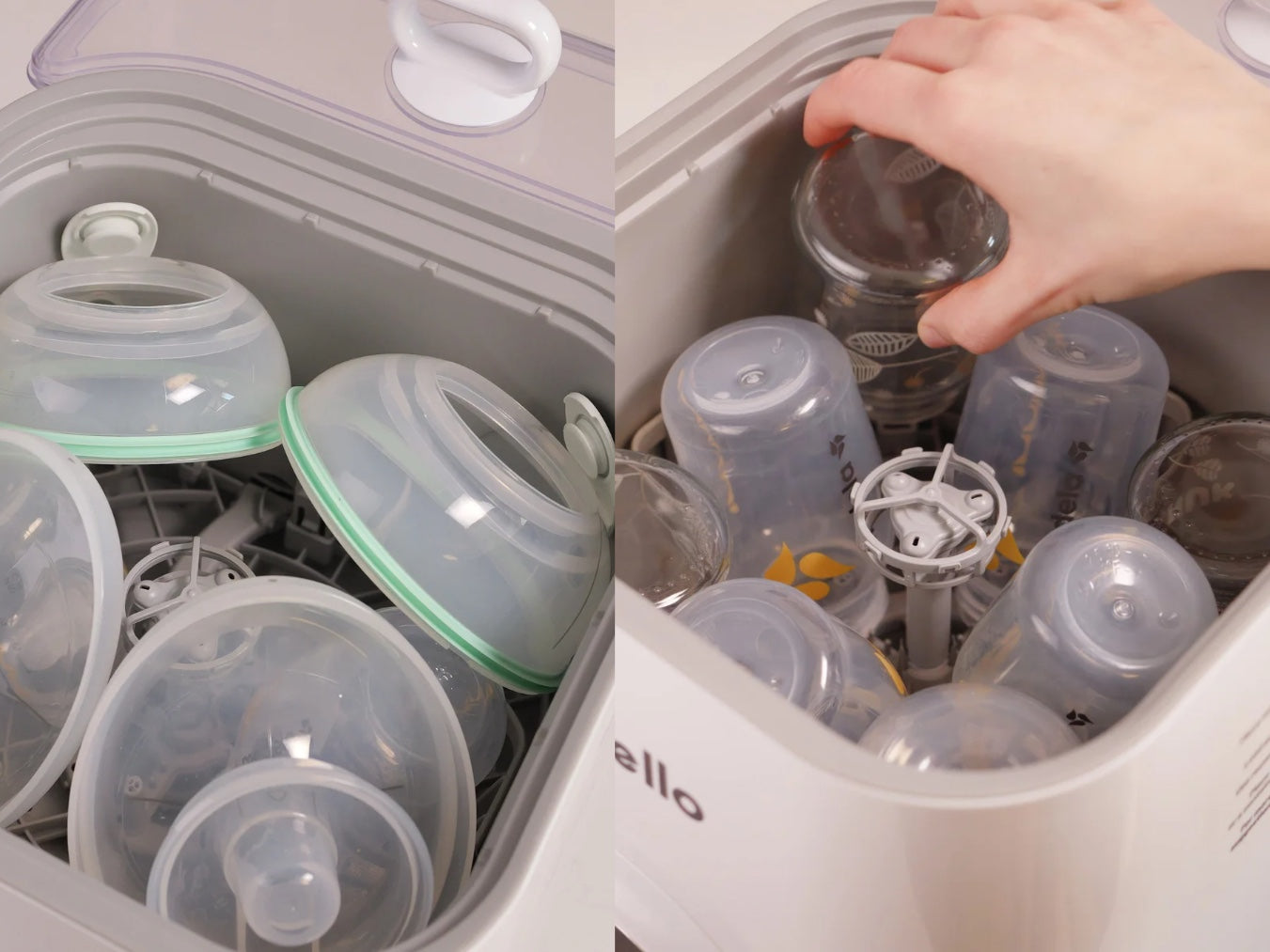 Baby bottles, pump parts, and feeding accessories at the ready. With just a 19-minute dynamic cycle, Bebello Washer zips out germ-free, dry parts that are NHS-grade clean—faster than you can say “bottle time."